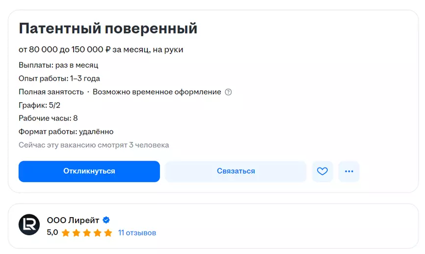 Профессия патентного поверенного востребована. Об этом свидетельствует растущий спрос на квалифицированных специалистов, особенно в сферах товарных знаков и интеллектуальной собственности. Компании из сфер IT, фармацевтики, машиностроения и телекоммуникаций активно ищут таких специалистов. Наибольшее количество вакансий сосредоточено в крупных городах России: Москве, Санкт-Петербурге, Екатеринбурге и Новосибирске. Компании выделяют больше средств на расширение отделов управления интеллектуальной собственностью.