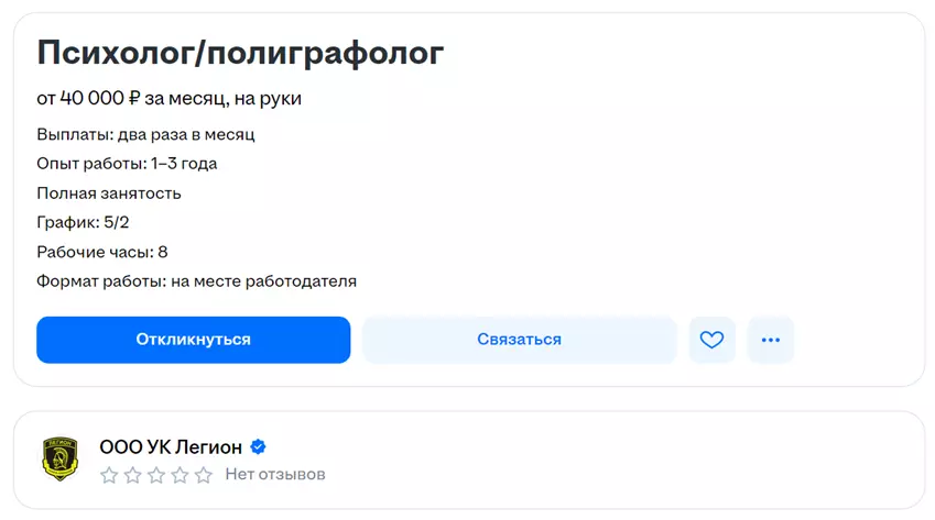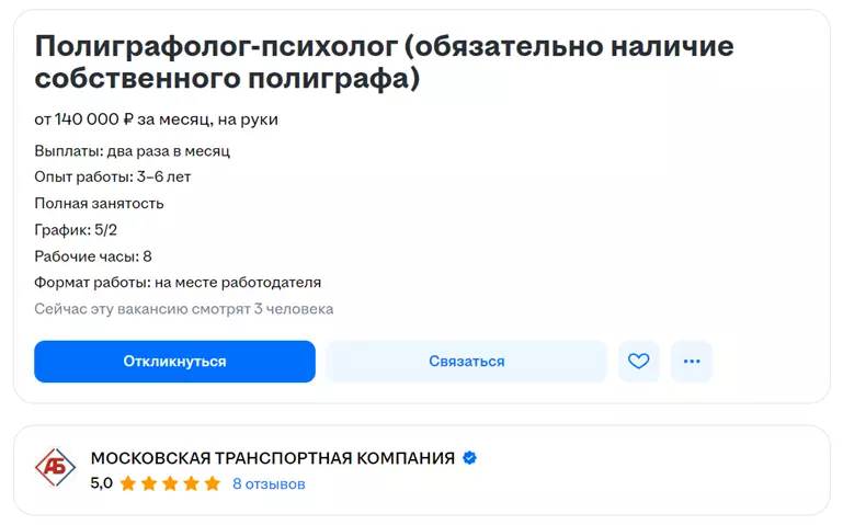 Вакансий для полиграфолога на сайтах поиска работы немного. Например, в октябре 2025 году удалось найти всего 20 вакансий. Минимальный уровень зарплат начинается от 40 000 рублей, максимальный зафиксированный уровень — 140 000 рублей (на такую вакансию требуется специалист с собственным полиграфом).
