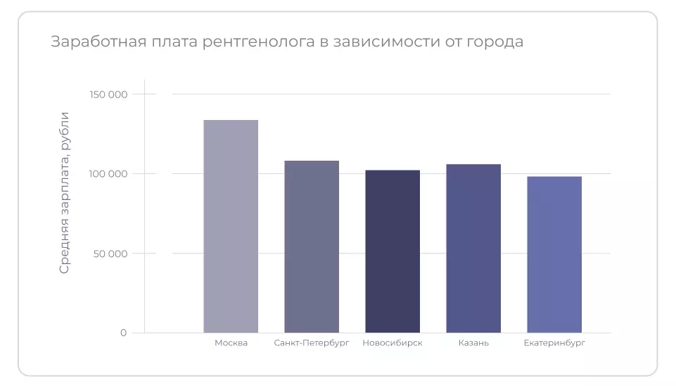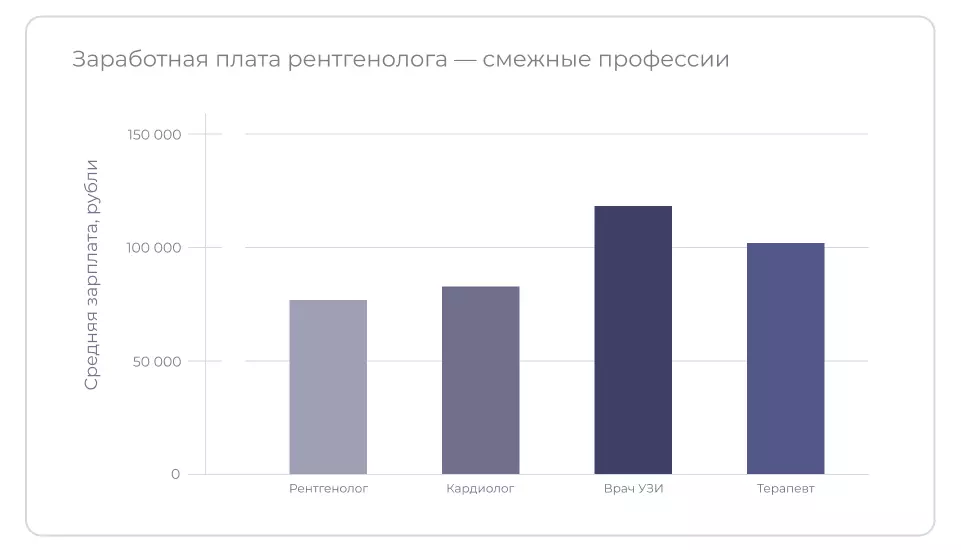 По данным сервиса ГородРабот.ру, средняя зарплата рентгенолога в России в 2025 году составляет 76 700 руб. Учитывайте, что статистика показывает предложения работодателей, а не реальные зарплаты с учётом премий, надбавок и работы на полторы ставки.