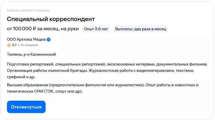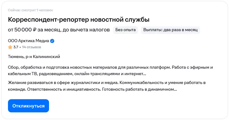 В открытых источниках встречаются вакансии для репортёров с заработной платой от 30 тыс. руб.
