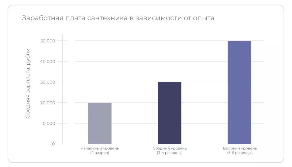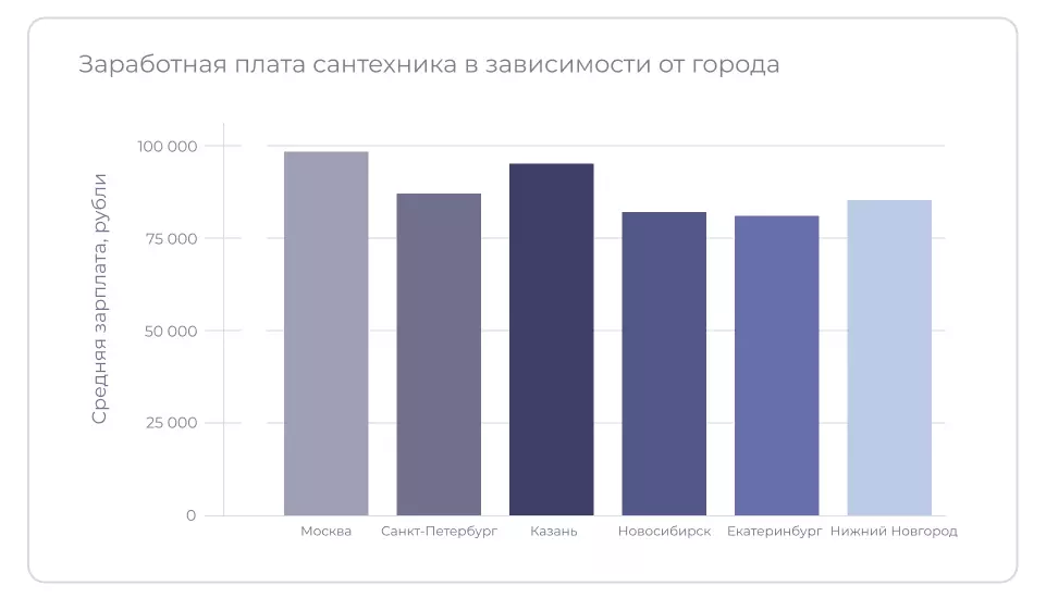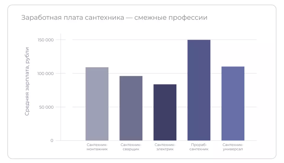 По данным ГородРабот.ру, средняя зарплата сантехника в России за 2025 год ‒ 126 326 руб. А чаще всего в вакансиях встречается зарплата 165 000 рублей. Уровень дохода мастера зависит от разряда и специализации. Больше всего получают мастера 6 разряда и сантехники-универсалы, которые выполняют разные виды работ. Средние зарплаты в Москве выше, чем в других регионах. Доход сантехника, работающего на себя, зависит от умения рекламировать услуги и находить клиентов.