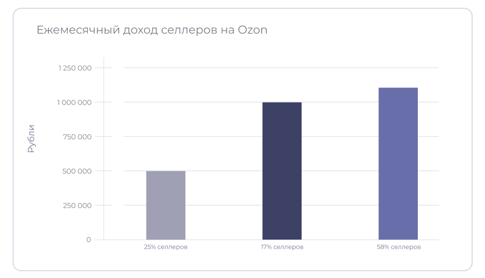 В 2024 году Центр развития предпринимателей PRO Wildberries и банк «Точка» изучили ежемесячный доход селлеров с опытом работы на площадках от 1 года. Доход селлеров на Ozon в рублях составил: