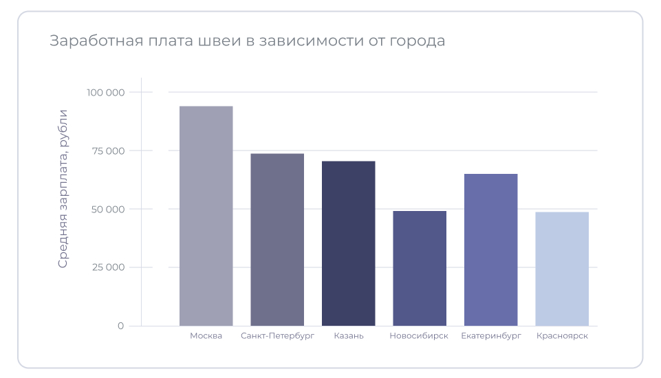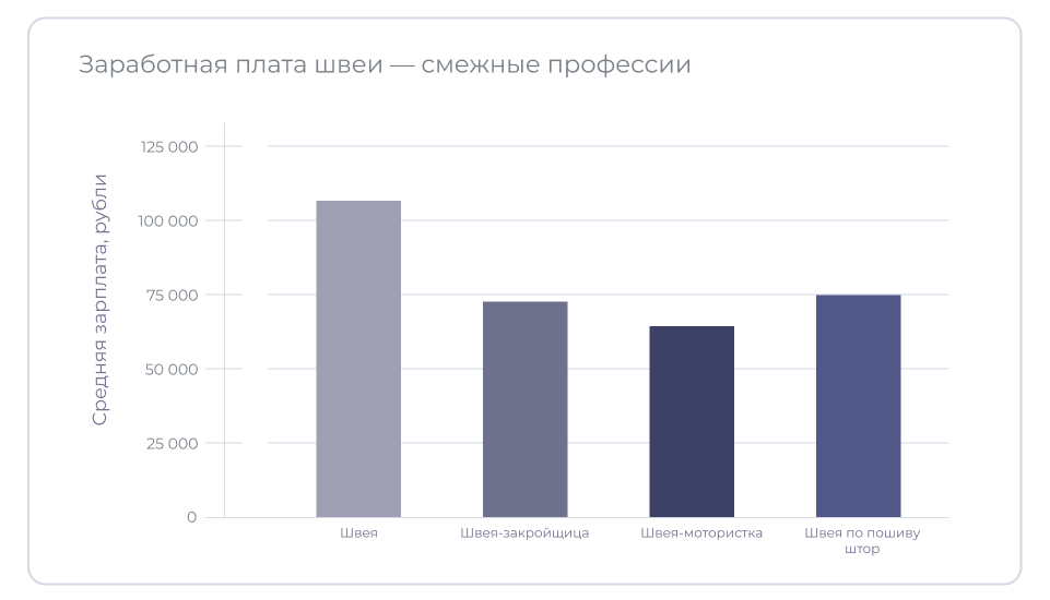 Заработок швеи зависит от опыта работы и специализации. Доход работников ателье зависит от его популярности и времени года: сотрудники получают больше в сезон свадеб и выпускных, перед новогодними праздниками. Зарплаты на производстве зависят от бюджета предприятия. В Москве специалисты получают больше, чем в регионах России. Доход швеи, работающей на себя, зависит от умения продвигаться и находить клиентов.
