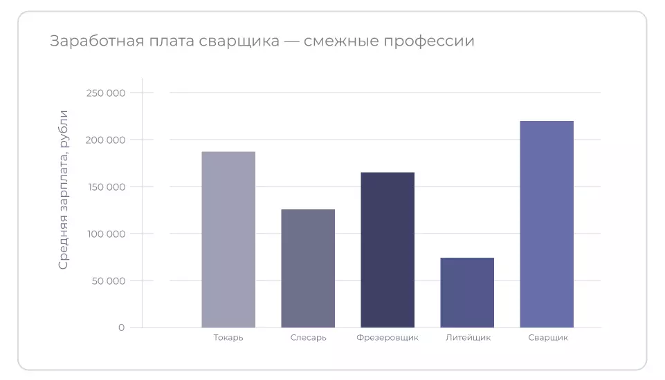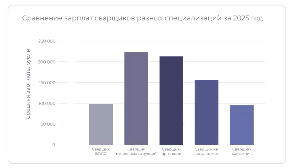 По данным сайта ГородРабот.ру, средняя зарплата сварщика в России — 219 443 рубля в месяц. Этот показатель на 78% выше средней заработной платы по стране за 2025 год.