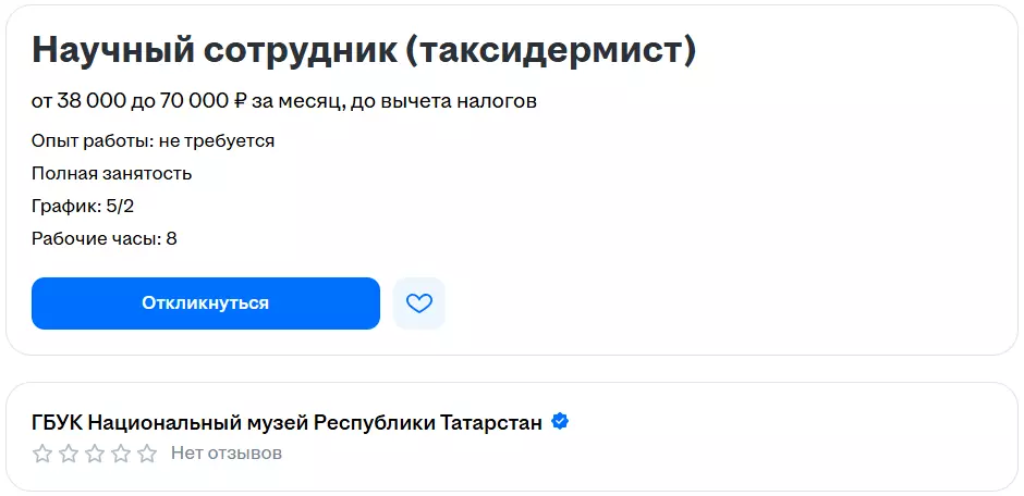 Заработок таксидермиста зависит от квалификации, специализации, региона и формата работы. Разброс в вакансиях — от 30 000 до 100 000 рублей. Если мастер работает на себя, его доход ограничен только временем, которое затрачивается на каждый проект.