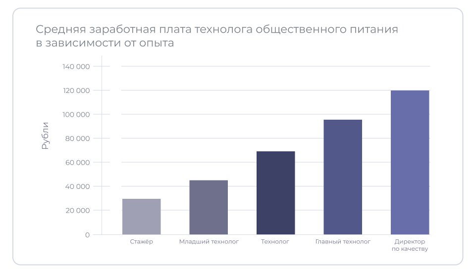 Профессиональный путь начинают с позиции младшего технолога или техника-технолога в столовых, фабриках-кухнях или пищевых производствах. Опыт в контроле качества, разработке меню и оптимизации процессов позволяет вырасти до заведующего производством или шеф-технолога. Ещё один вариант — открыть собственный бизнес.