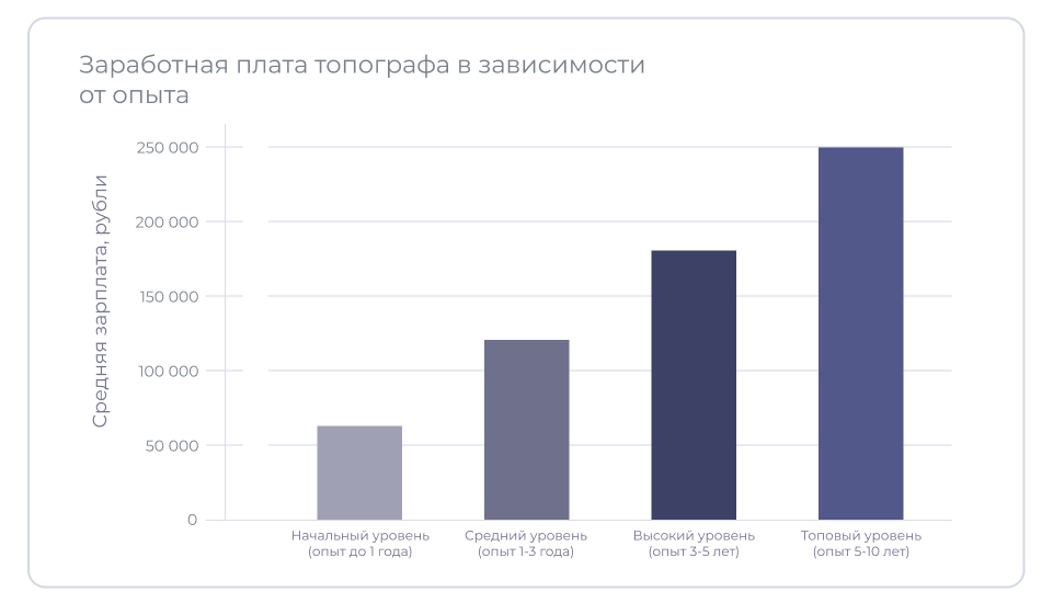 Зарплата топографа зависит от специализации и опыта. Чем выше квалификация у эксперта, тем больше он зарабатывает. Опытные специалисты могут работать в крупных компаниях с высокими зарплатами. Топографы с именем и репутацией участвуют в масштабных проектах, которые хорошо оплачиваются. Средние зарплаты в Москве и Санкт-Петербурге выше, чем в регионах.