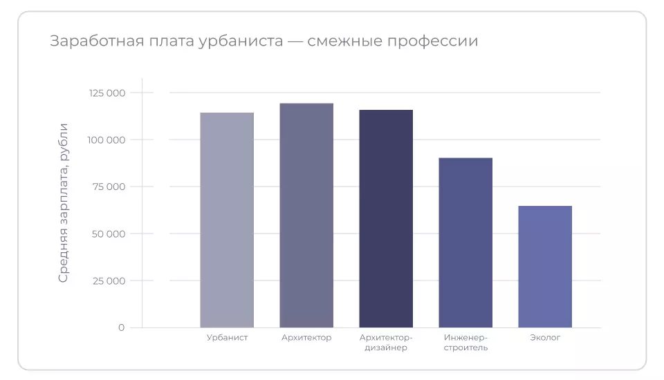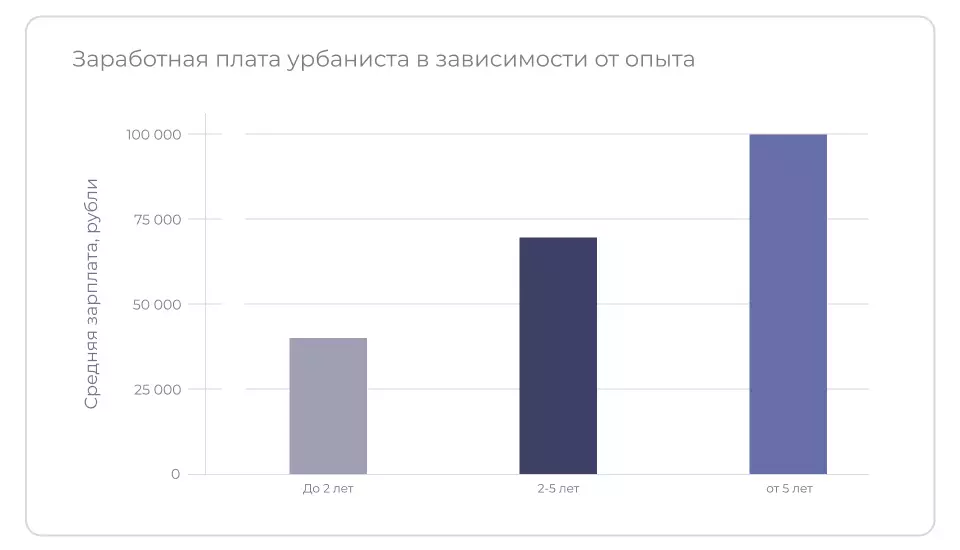 Профессия урбаниста новая для России, и сравнительный уровень зарплат ещё не сформирован. Одни компании ищут работников на зарплату 70 000 рублей, другие готовы предложить до 200 000 рулейб. Уровень дохода эксперта зависит от квалификации и опыта, сложности проектов, с которыми он работает. В городах-миллионниках больше вакансий и выше зарплаты, но вместе с тем и конкуренция за рабочие места.