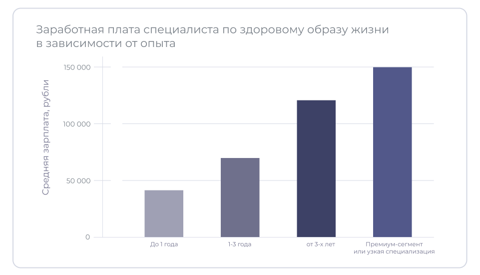 Заработок эксперта зависит от опыта работы и квалификации. На доход влияет и умение сделать личный бренд и продвигать себя, строить деловые связи. Сколько денег можно получать, почти не зависит от региона, потому что консультанты по здоровому образу жизни часто консультируют по интернету.