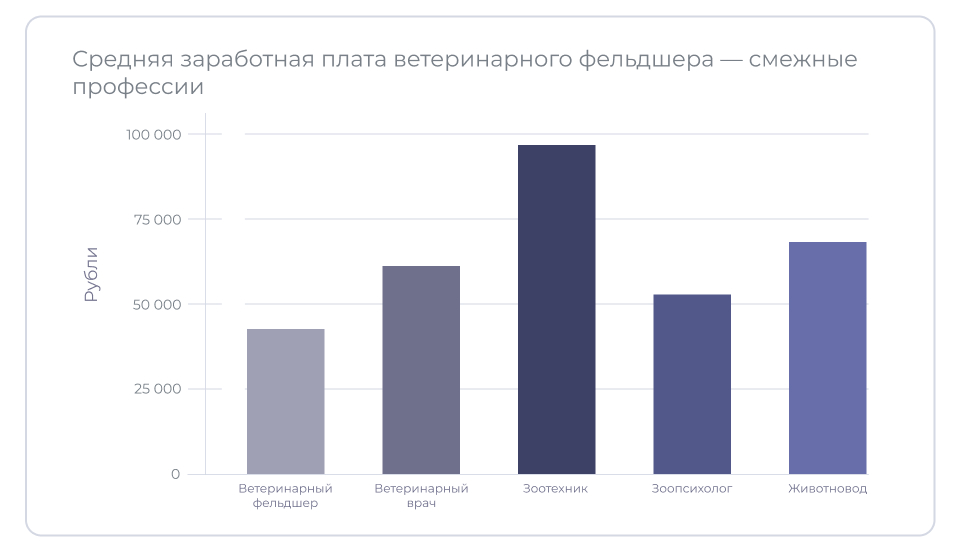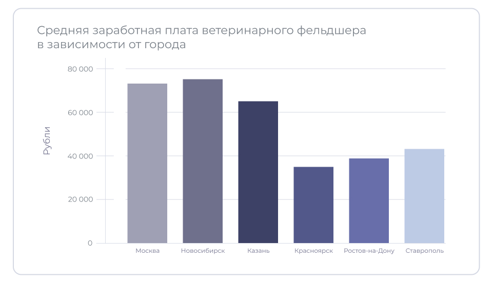 По данным сайта «ГородРабот. ру», ветеринарные фельдшеры в России в 2026 году зарабатывают в среднем 42,3 тыс. руб. в месяц. Чаще всего в вакансиях встречается зарплата 50 тыс. руб.