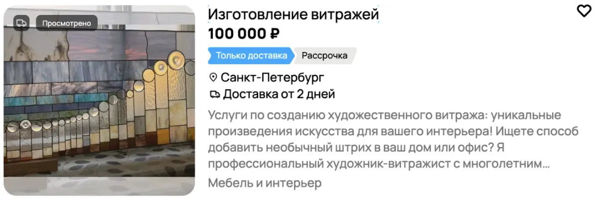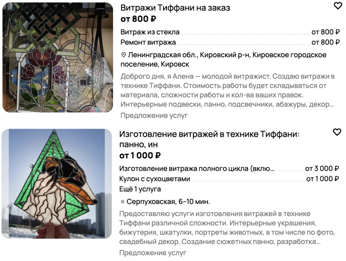 Художники-витражисты выполняют заказы разного уровня — как небольшие изделия стоимостью от 800 руб., так и более масштабные — от 100 000 руб. Клиентов находят с помощью рекомендательных сервисов, например «Авито» и «Профи. ру».