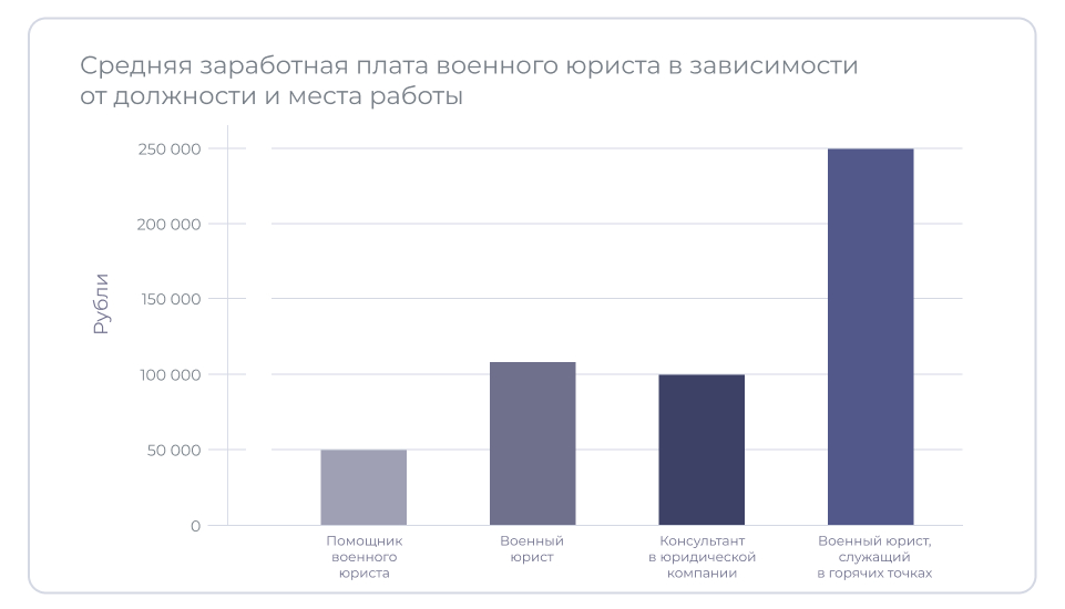 Сотрудники юридических фирм «на гражданке» в среднем получают 100 000 руб. в месяц, а наиболее высокие доходы зафиксированы у военных юристов, которые служат в горячих точках и имеют высокое звание. Такие специалисты ежемесячно зарабатывают более 250 000 руб.