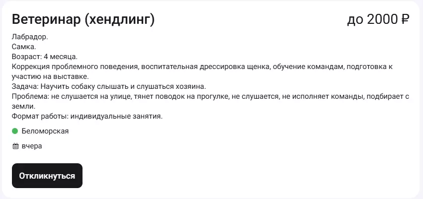 - У многих владельцев нет времени заниматься ринг-дрессурой. Хендлер берёт на себя подготовку, составление графика выставок и сопровождение животного на соревнованиях.