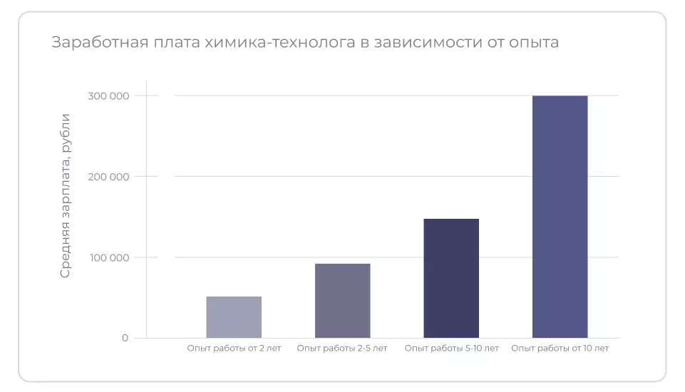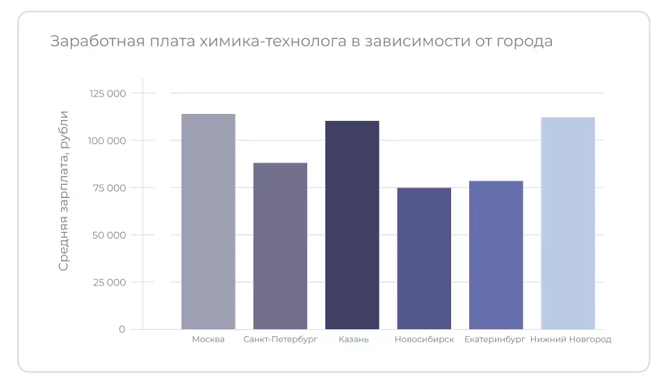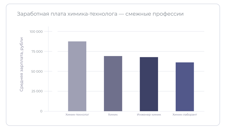 По данным сайта ГородРабот.ру, средняя зарплата химика-технолога в России за 2025 год составляет 87 011 рублей. Чаще всего в вакансиях встречается зарплата в размере 100 000 рублей. В крупных городах заработок выше, чем в отдалённых регионах. Доход специалиста также зависит от размера и финансового состояния компании, где он работает. В корпорациях федерального уровня самые высокие зарплаты.