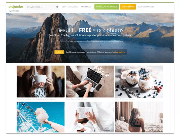 Бесплатный фотобанк с огромным количеством фото, разделенных по категориям. Для загрузки снимков не требуется регистрация.