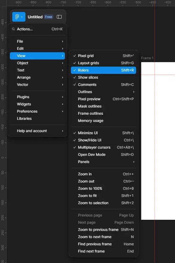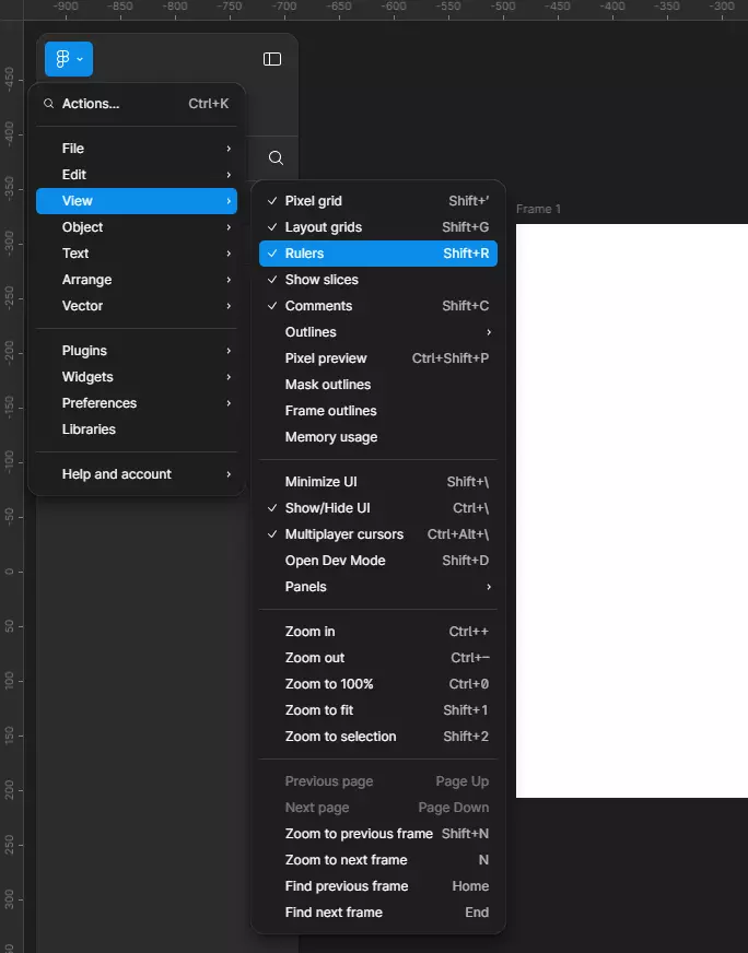 Нажав эту комбинацию, вы вызовете линейку на экран. Если линейка уже была включена, то повторное нажатие SHIFT+R позволит её скрыть или выключить. Кроме того, линейки можно достать через меню. Для этого нажмите View (Просмотр) в верхней-левой панели Figma и выберите Rulers (Линейки).