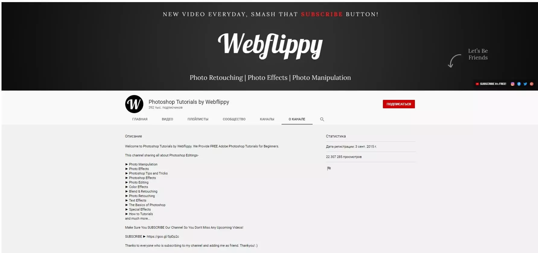 Photoshop Tutorials by Webflippy - еще один известный канал на YouTube. У него около 197 тысяч подписчиков. На этом канале вы найдете очень полезные и удивительные уроки, от работ со светом до серьезных проектов.