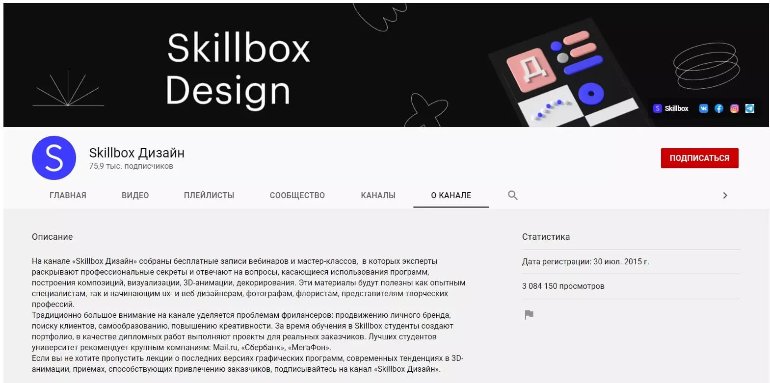 Skillbox – известная платформа обучающих курсов, среди материалов которой также имеются и метариалы по изучению программного обеспечения для дизайна. Канал нацелен на детальное изучение программы с нуля, с применением технических и профессиональных знаний.