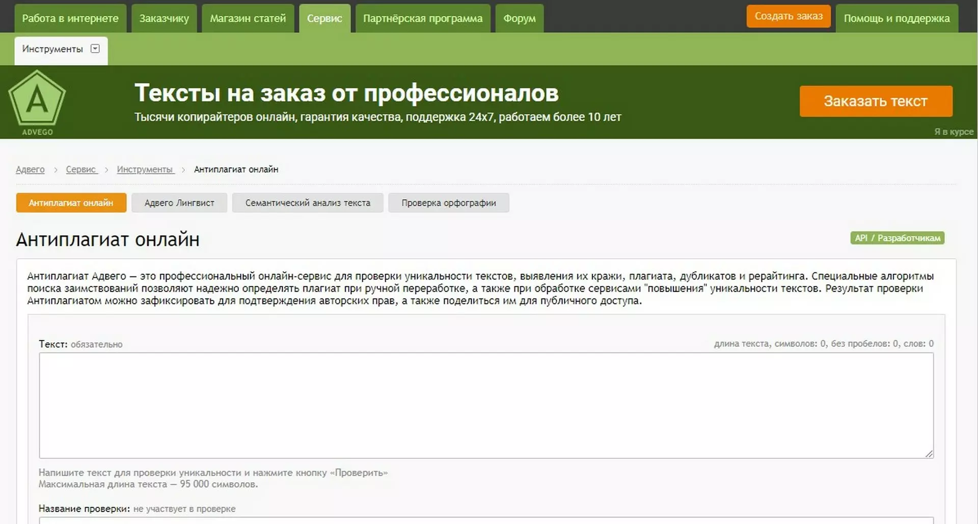 Дополнительные функции: На сайте есть модули для проверки орфографии и SEO-аналитики. Сервис не проверяет стилистику и пунктуацию.