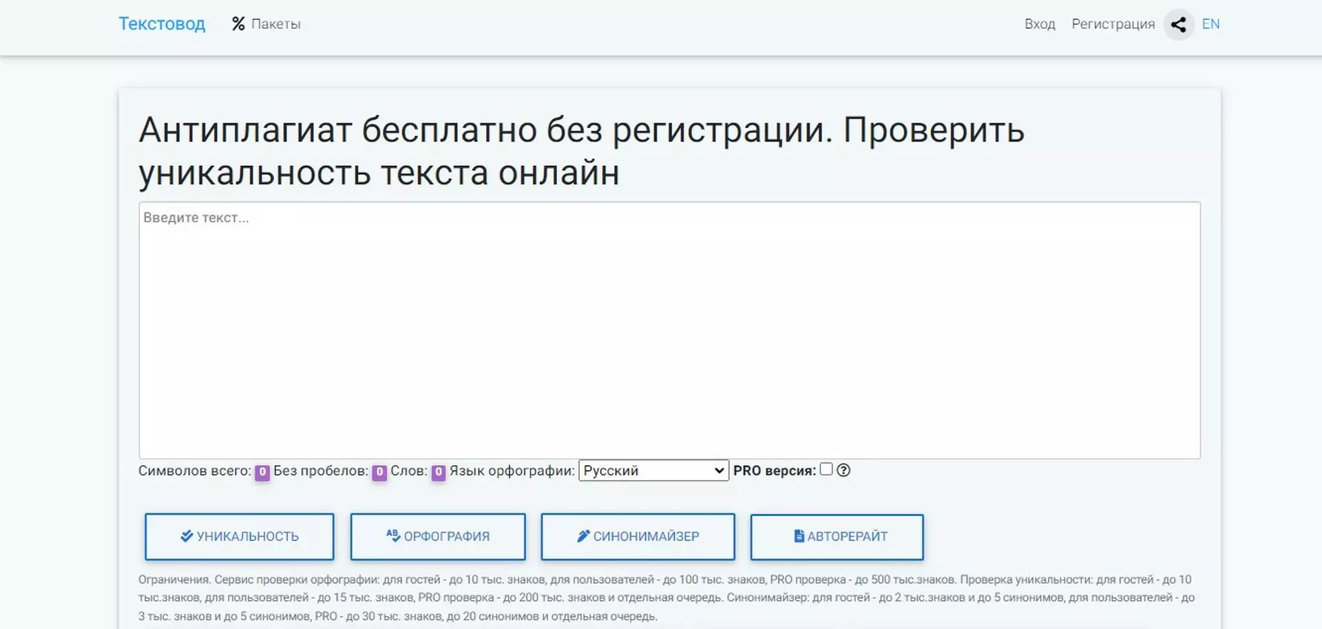 Ограничения символов: Без регистрации можно проверять до 3 000 знаков в сутки. После входа в аккаунт лимит увеличивается до 5 000. Активные пользователи проверяют до 10 000 символов в сутки.