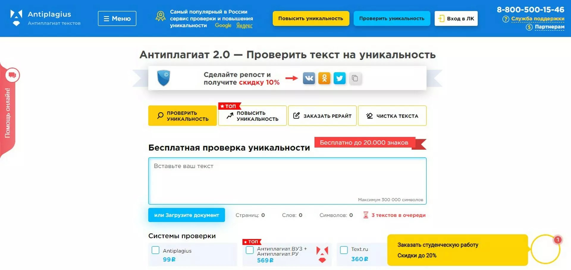 Ограничения символов: Бесплатно и без регистрации можно проверить до 15 000 знаков в сутки. Если зарегистрироваться и подтвердить телефон, лимит увеличится до 50 000 символов. Платные тарифы дают возможность загружать до 300 000 символов. Чтобы проверить большой объем без регистрации, разделите исходник на фрагменты.