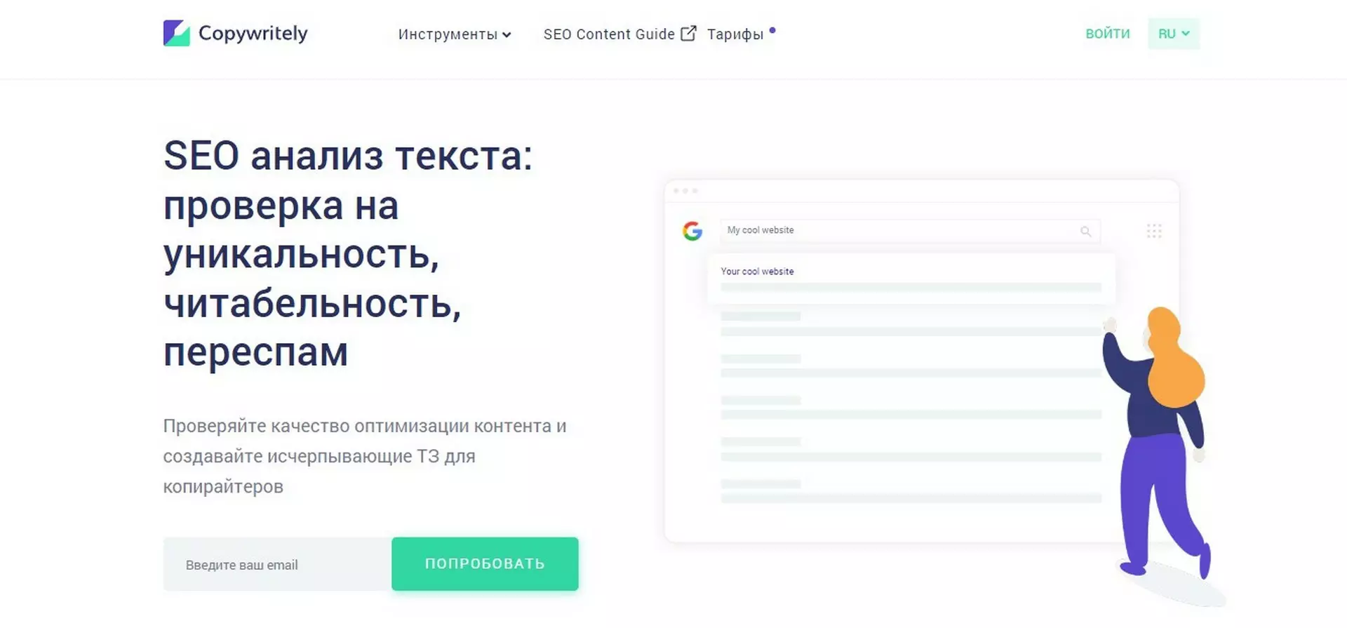 Иностранная платформа, доступная для пользователей из России. Сайт открывается без VPN, но не принимает платежи с российских карт. Работать с текстами можно в бесплатном режиме. Сайт проверяет уникальность, читаемость и чистоту на русском и английском языке. Бесплатно за сутки можно проверять до 2 500 слов (не символов).
