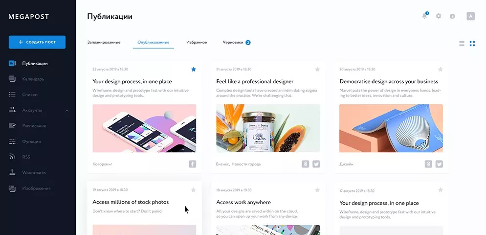 Российский сервис Мегапост помогает создавать публикации, наносить водяные знаки, управлять страницами и группами. В число интересных возможностей входит объединение проектов в папки для оптимизации управления, настройка автоматических действий при срабатывании триггера. В бесплатном режиме можно работать 7 дней. Цена тарифа начинается от 230 руб. в месяц.