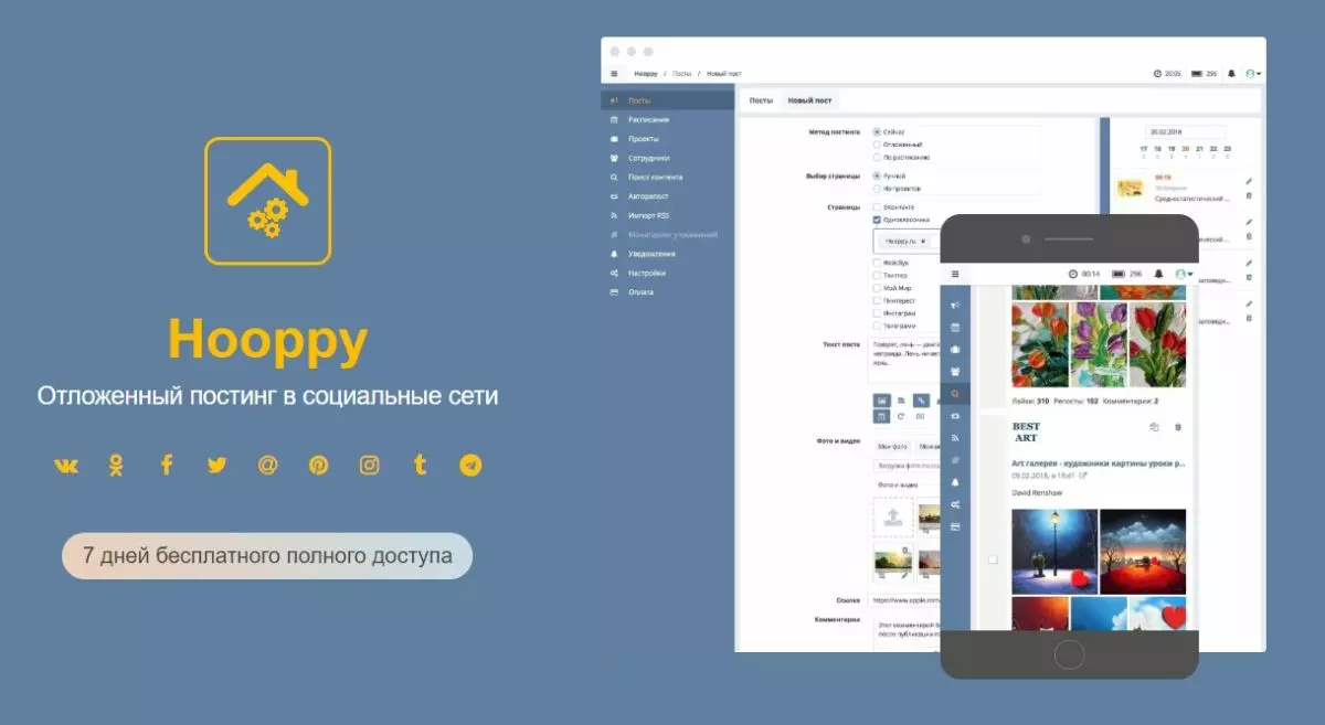 Сервис Hoopy позволяет настроить публикации по времени, переносить контент из одной соцсети в другую. Алгоритм может парсить посты из указанных сообществ и по хэштегам. Особенностью сервиса является разный набор функций для каждой доступной соцсети.