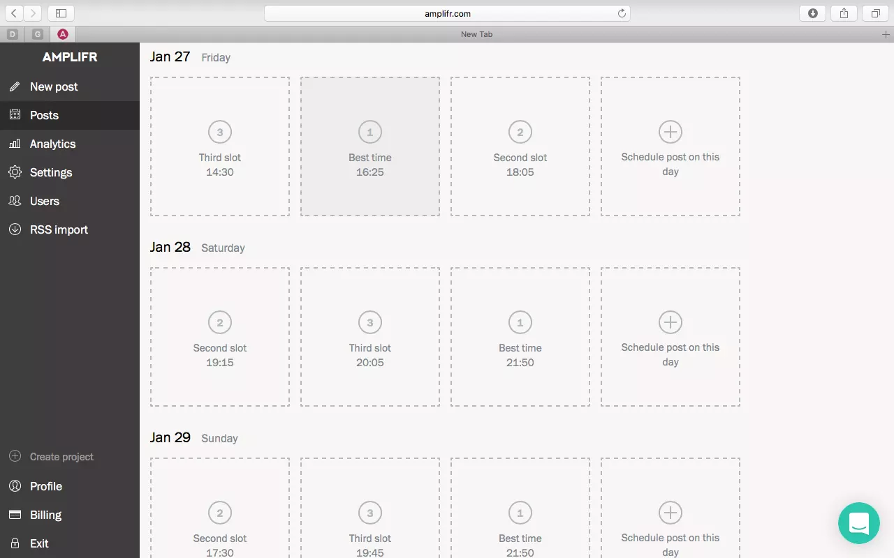 Приложение для отложенного постинга Амплифер работает с 9 соцсетями, включая Tumblr, Viber, Google+, Pinterest. Перечень доступных опций включает: