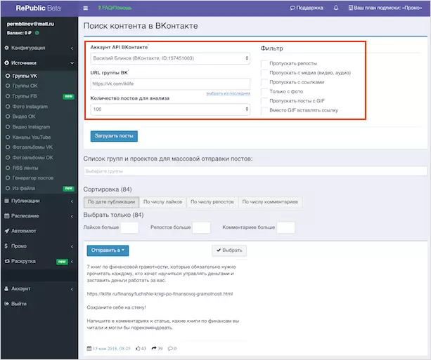 Сервис RePublic подходит для работы в соцсетях ВК, ОК и Telegram. Инструмент подходит для автоматического ведения страниц. RePublic выполняет парсинг записей, поиск видео на Youtube. Предусмотрен генератор цитат на фото и взаимная раскрутка с помощью других пользователей. Демо режим открыт 3 дня, цена продвижения начинается от 99 руб. в месяц.