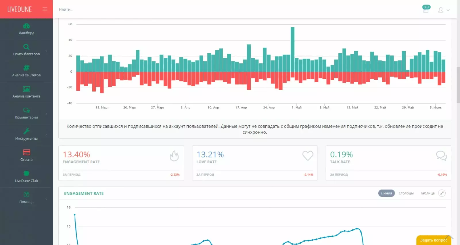Универсальный сервис для организации продвижения в социальных сетях. Он составляет отчеты каждый час и позволяет выгружать аналитику. К преимуществам LiveDune относится: