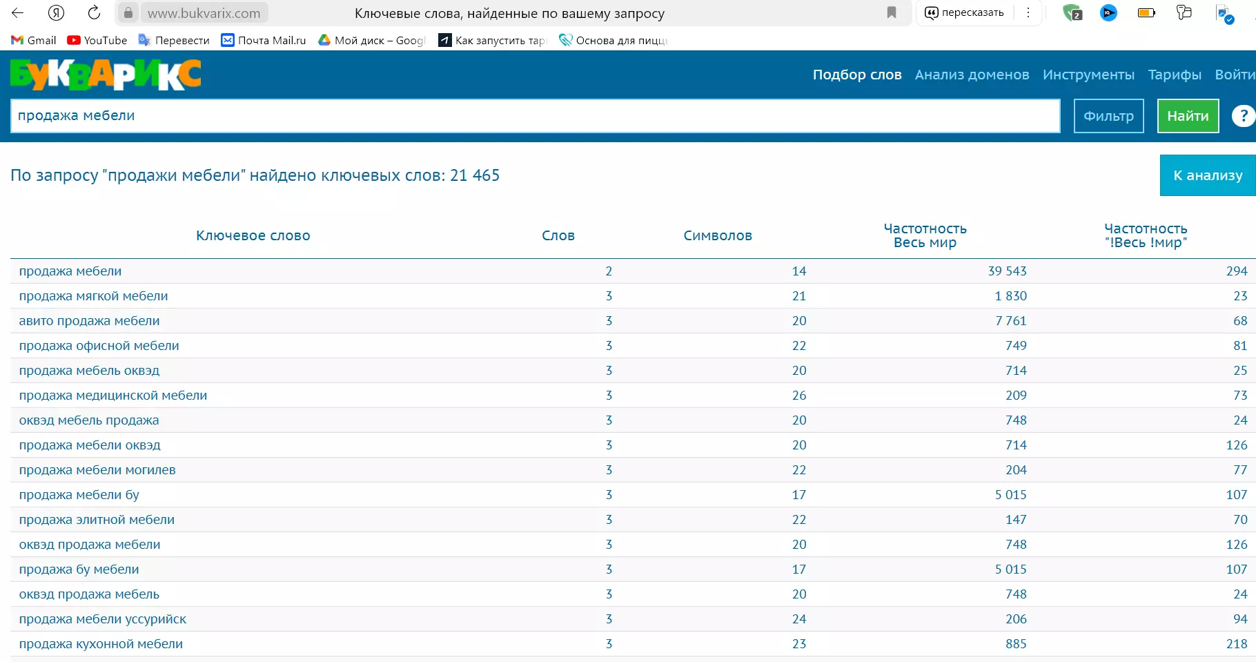 Ключевые слова по запросу “продажа мебели” в “Буквариксе”. Источник: bukvarix.com