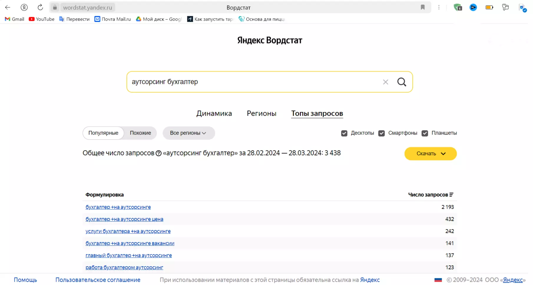 Ключевые запросы по теме: “Аутсорсинг бухгалтер”, согласно Вордстату. Источник: wordstat.yandex.ru