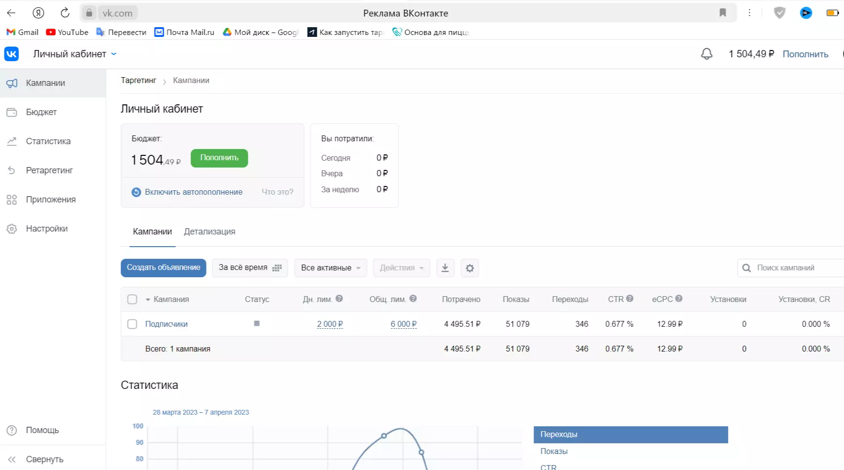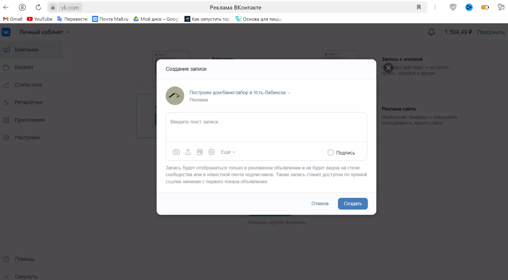 - Создать рекламный кабинет и пополнить минимум на 500 рублей.