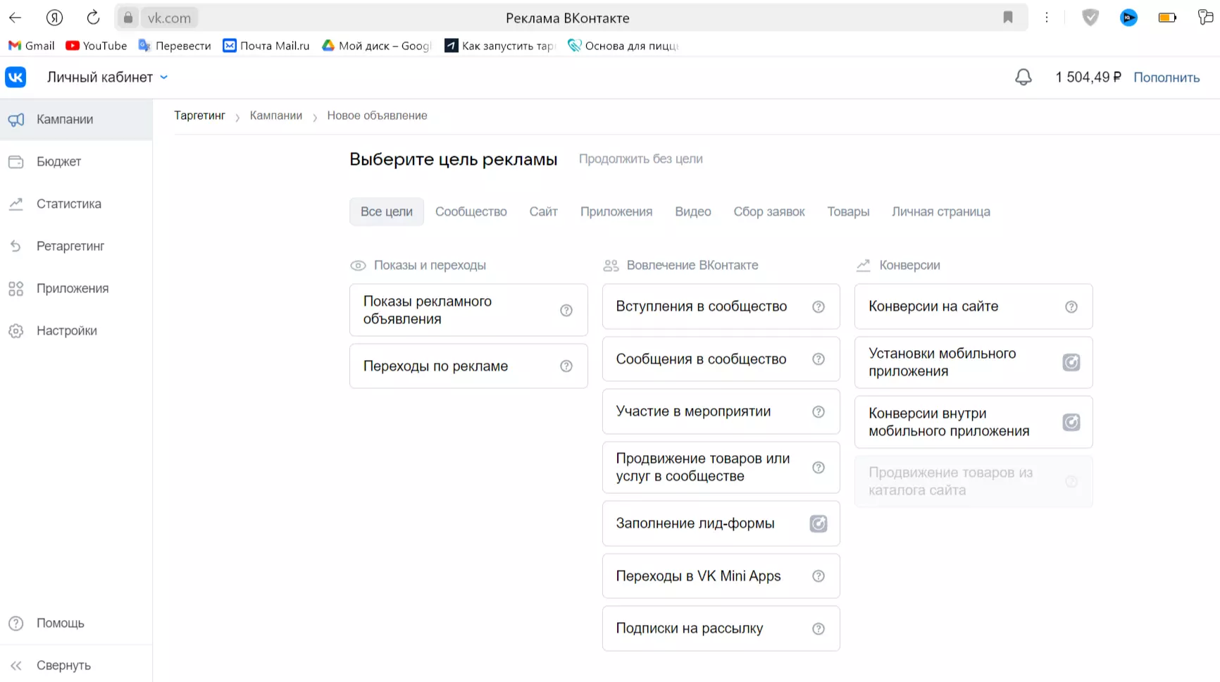 Кликните на «Создать объявление», выберите цель таргета: показы и переходы, вовлечение или конверсии. Определитесь с моделью оплаты: за подписку, установку приложения, заполнение лид-формы. Для начала лучше выбрать “Переходы по рекламе”, чтобы точно знать сумму списания и легче управлять бюджетом. Например, чтобы самостоятельно настроить рекламу для группы ВК, выберите “Вступления в сообщество”.