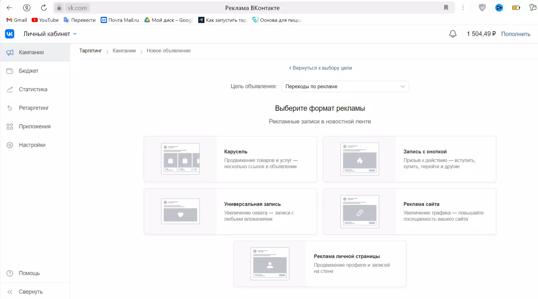 Картинка 6. Выбор формата рекламной записи. Источник: vk.com