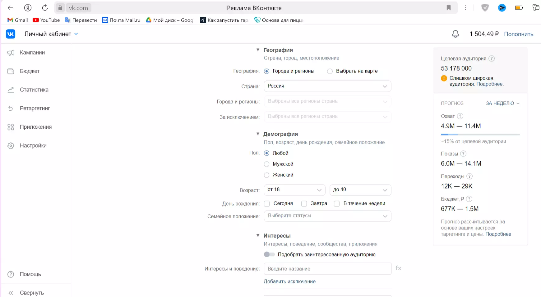 - Настройте целевую аудиторию. Выставите параметры: географические и демографические показатели, интересы, образование, ключевые запросы. Например, таргет арт-пространства в Мурманске охватывает жителей города, которые увлекаются искусством, культурой, историей. Прежде чем перейти к следующему этапу, проверьте охват. Он не должен быть слишком большим. Оптимально – до 2000.