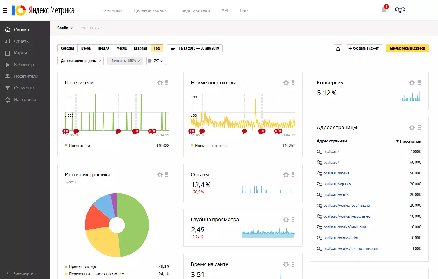 Основной плюс сервиса – возможность бесплатного использования. Яндекс.метрика позволяет подключить разные опции для проведения рекламных кампаний. Вебвизор предназначен для отслеживания поведения пользователей на сайте. Для анализа эффективности инвестиций маркетинга применяется сквозная или контентная аналитика. С ее помощью вебмастера могут посмотреть статистические данные рекламных каналов. Карты ссылок позволяют увидеть переходы между ссылками, которые находятся на сайте. Для интернет-магазинов можно подключить статистику электронной коммерции, отображающей количество продаж. Сервис имеет инструмент статистики, позволяющий контролировать количество переходов.