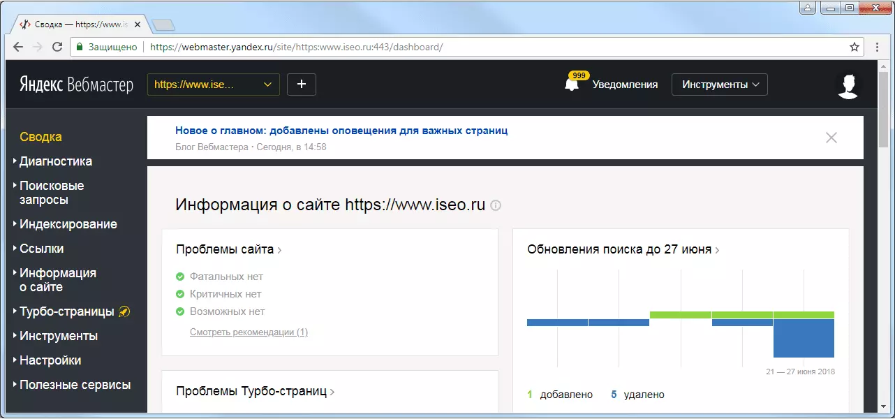 Весь функционал программы сайта представлен в меню. На странице сводки находятся виджеты, с помощью которых можно отслеживать такие показатели, как обновления поиска, проблемы на сайте и обновления. Кнопка плюсика позволяет добавить новые площадки. Предусмотрен в программе и набор полезных инструментов, которым может пользоваться вебмастер. Яндекс.вебмастер представляет собой многопрофильный инструмент с понятным интерфейсом на русском языке. Из минусов стоит отметить то, что сервис подходит для анализа собственных сайтов.