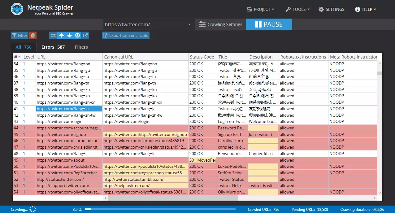 Для крупных порталов подходит инструмент Netpeak Spider. Его применяют для технической оптимизации. Даже за одно сканирование можно увидеть все основные проблемы – недочеты с индексацией, пустые Alt, дублирование контента и ошибки доменов. Программа выделяет ошибки специальными цветами. Пользователь может запустить проверку карты ресурса в txt, html, xml.