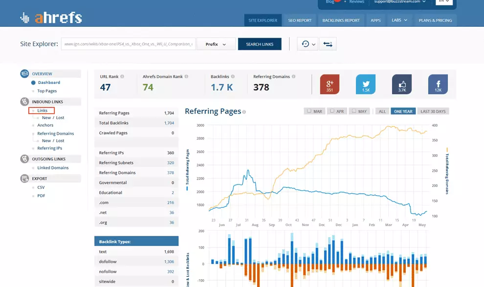 С помощью программы можно посмотреть рейтинг доменов и важных страниц на сайте. Эти показатели должны расти в процессе продвижения. Только Ahrefs поможет выполнить качественный ссылочный аудит в кратчайшие сроки. Система позволяет сэкономить время и силы. Пользователи могут увидеть, какие ключевые запросы преобладают – безанкорные, брендовые и продающие. Дополнительно можно сделать отчет, а также выполнить сортировку по количеству ключевиков.