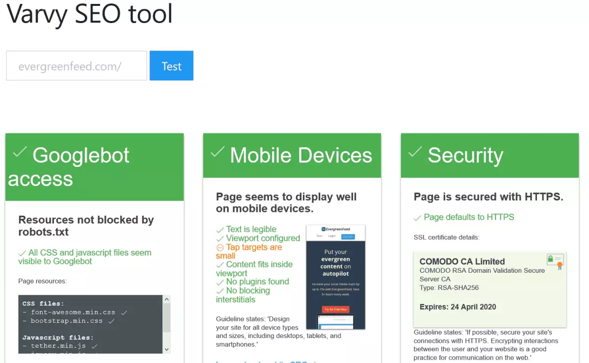 Новичкам в продвижении сайтов подойдет этот удобный инструмент. С его помощью можно сделать короткий анализ с быстрыми выводами, которые понятны даже непрофессионалу. Сервис помогает проверить скорость сайта, соответствие гаджетам и выполнить общий seo анализ. Все результаты отображаются в отдельных блоках.