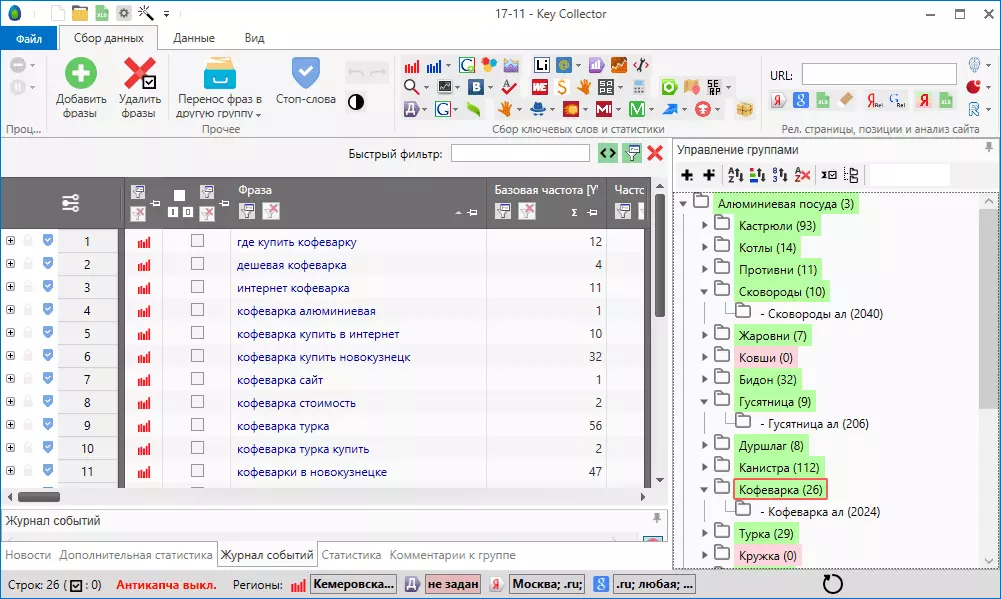 Сервис помогает найти запросы из поисковых систем и ресурсов конкурентов. В качестве источников используется Яндекс.Вордстат, Mail, Google и Яндекс. Пользователи могут проводить оценку фраз по различным характеристикам, а также выполнять поиск по регионам. Программа позволяет собрать семантическое ядро и всю необходимую информацию для продвижения сайта. Особенность программы в возможности сбора точной частотности фраз. Благодаря сервису, сбор семантики автоматизируется. С помощью программы можно выполнять сбор ключевых запросов, а также сбор статистических данных с разных известных ресурсов и социальных сетей.