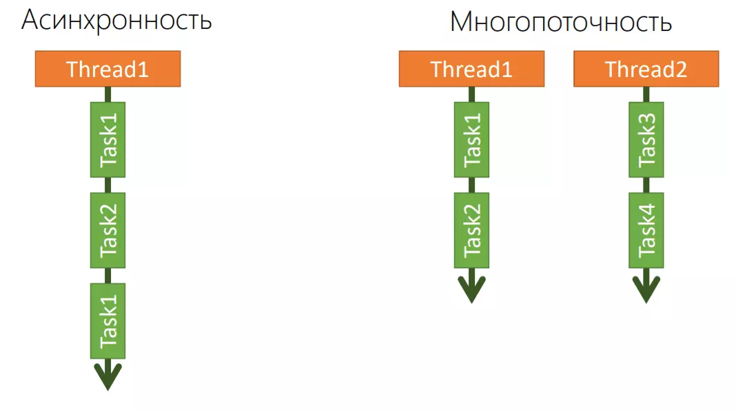 При чтении программы, процессор использует множество процессов. Затем выдаёт конечное действие на экран пользователя. Если процесс проходит линейно, каждый последующий блок кода попадал в блокировку. При скачивании фильма, компьютером нельзя пользоваться, пока 100% файла не загрузятся на жёсткий диск. Чтобы устройство могло выполнять другие функции во время чтения кода, все действия делятся на потоки. Для создания программ, позволяющих выполнять несколько действий одновременно, рассмотрим термины асинхронность и многопоточность.