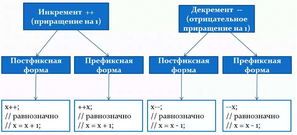 Инкремент и декремент имеют две формы – префиксную и постфиксную. В первом случае плюсы и минусы устанавливаются перед названием переменной, а именно в формате типа «++x» или «--x». Во втором случае обозначения располагаются уже после названия переменной – «x++» либо «x--».