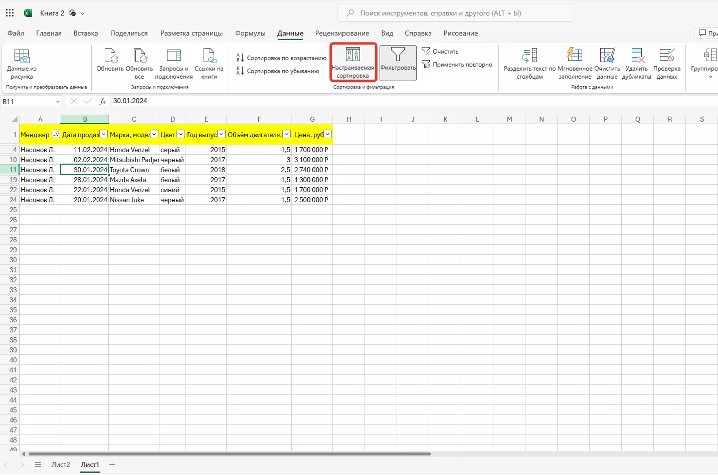 Сортировка применилась. Теперь все продажи менеджера автоматически выстроились в хронологическом порядке.