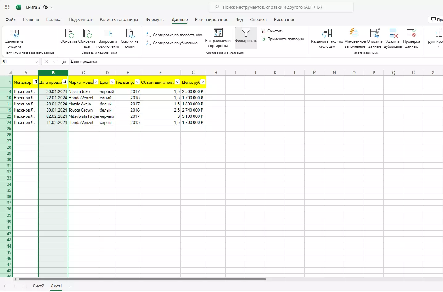 В каждый столбец вписываем соответствующие данные. В поле «Менеджер» вносим фамилии менеджеров по продажам автомобилей, в поле «Дата продажи» – число, когда была продана та или иная машина, и таким образом заполняем каждый столбец.