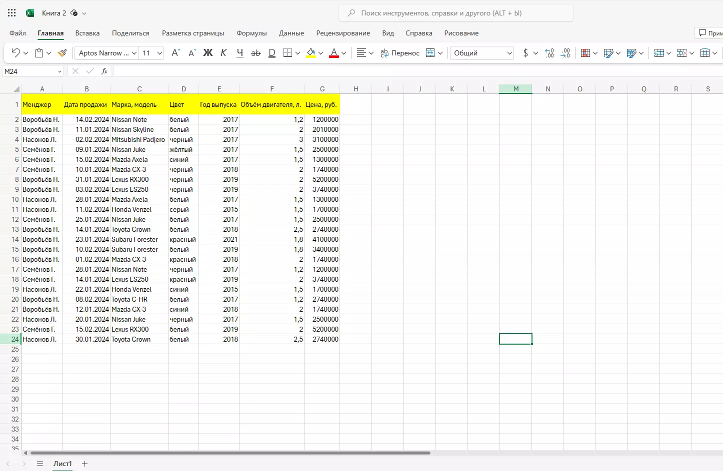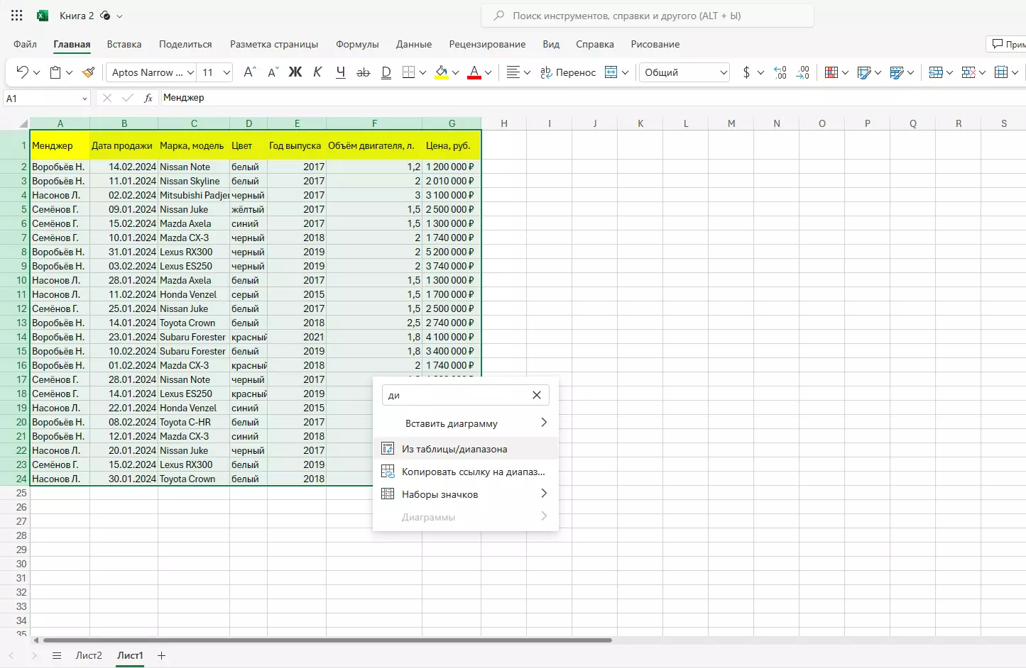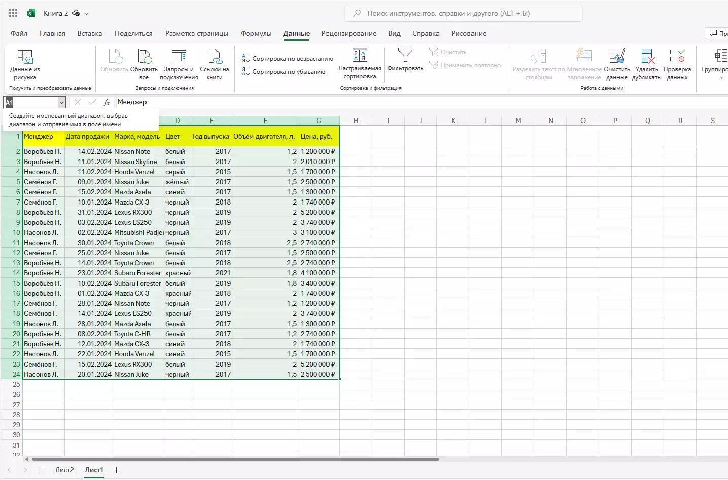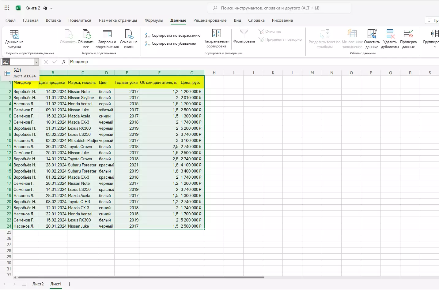 Давайте разберемся с процессом создания базы данных в Excel на практике. Возьмем для примера информацию о продаже автомобилей.