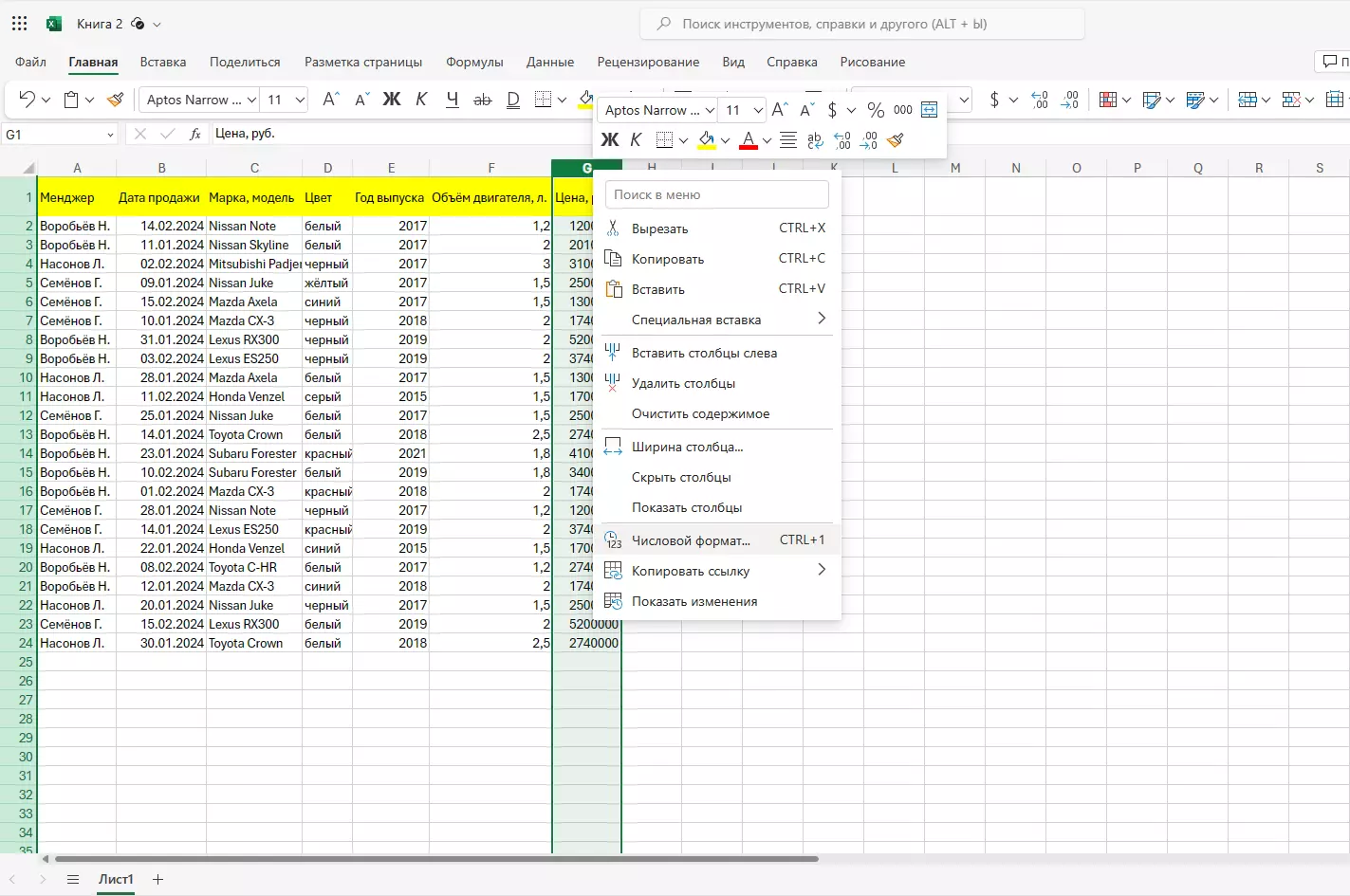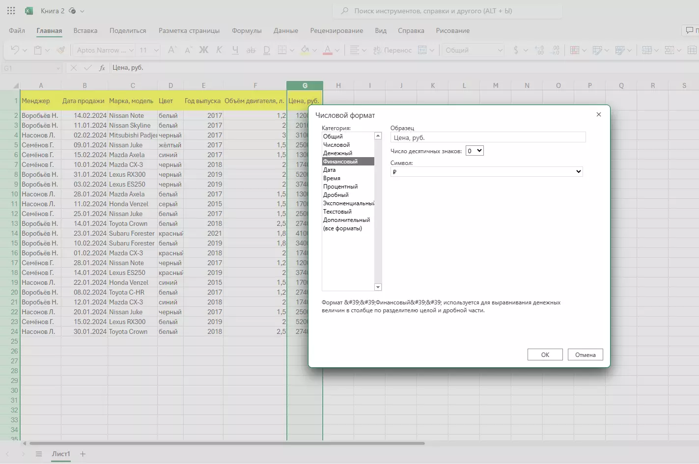 Проверим, соответствует ли формат ячеек вписанным в них данным. Изначально все ячейки имеют одинаковый формат. Его можно изменять по своему желанию. В нашем примере столбцы с фамилиями, маркой и цветом авто имеют текстовый формат. Столбец с датами продаж имеет формат даты. Столбцы с годом выпуска и объемом двигателя записаны в числовом формате, а поле с ценой – в финансовом.