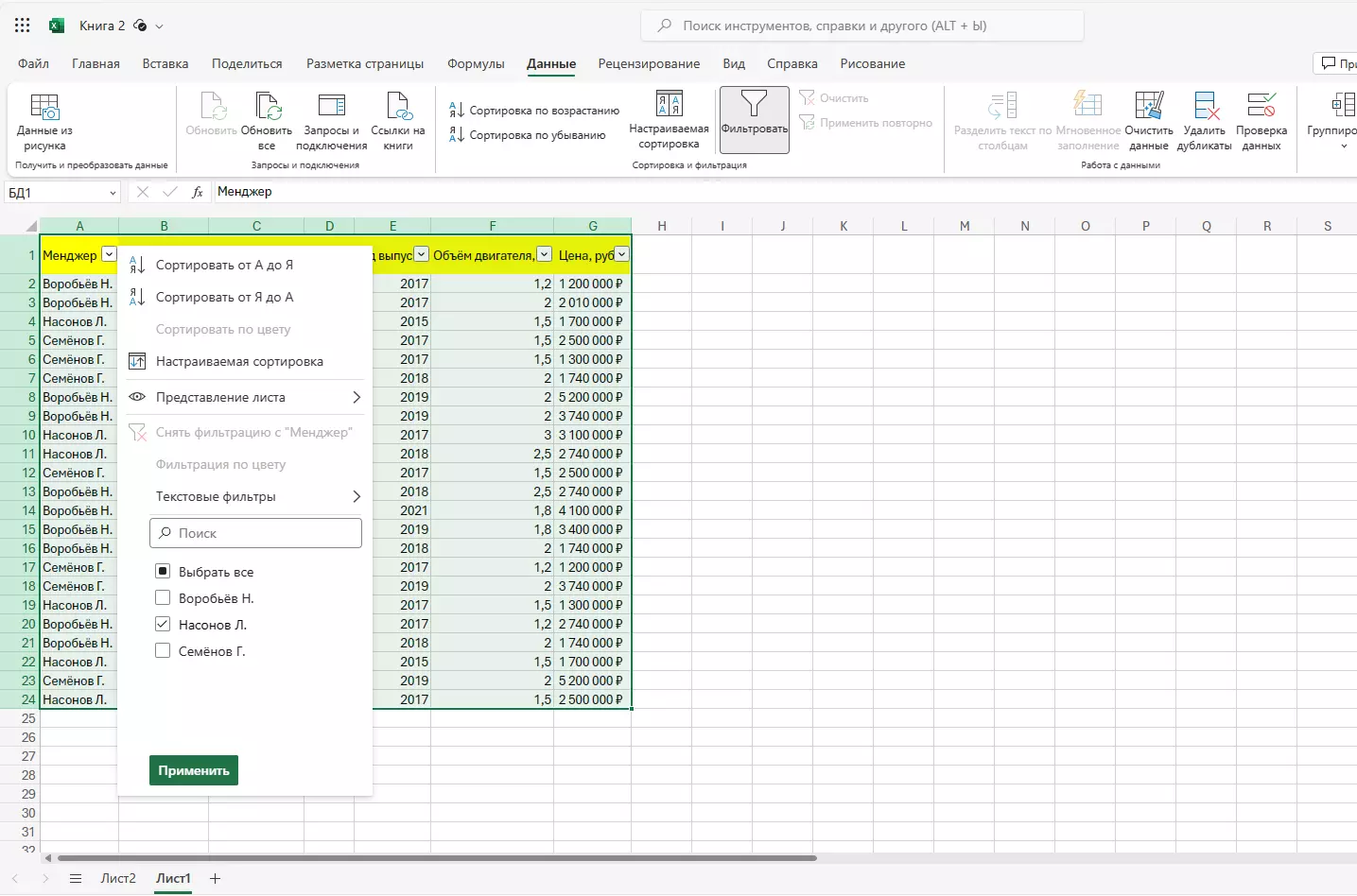 Теперь попробуем что-нибудь изменить в базе данных. Например, отфильтровать записи, чтобы база из всего объема данных показывала то, что требуется в текущий момент. Например, отфильтруем продажи одного менеджера из списка.
